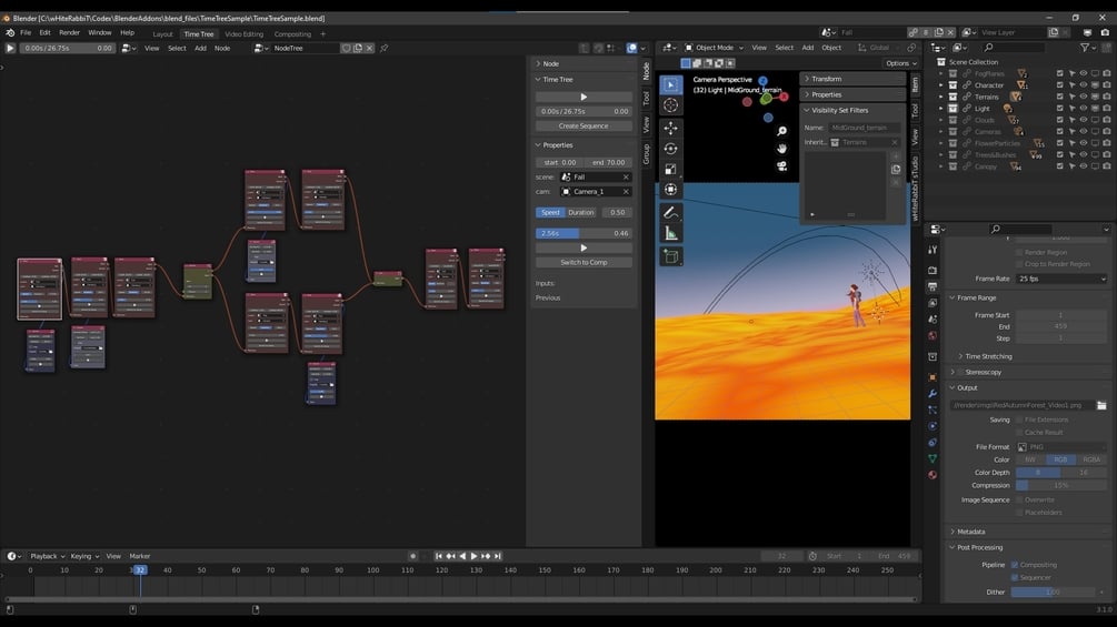 Time Tree is a Blender addon which adds a new way of dealing with Shot sequences using nodes instead of the common linear timeline.